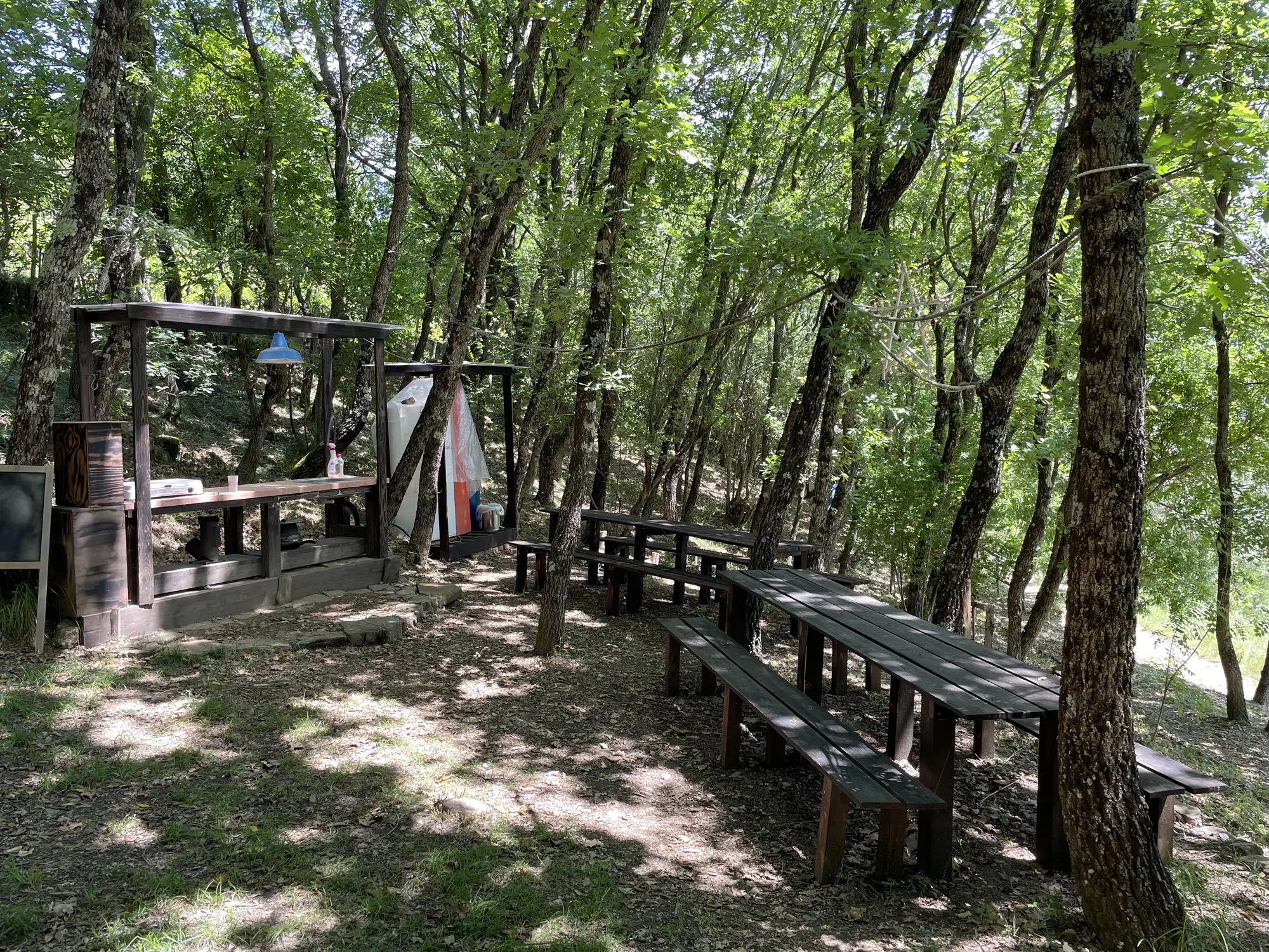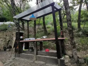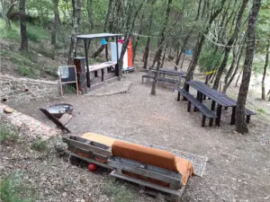 Al centro dell’area campeggio, in prossimità di un’antica fornace per la produzione di manufatti in argilla, è allestito uno spazio comune per il ristoro e la socializzazione, attrezzato con punto fuoco, barbecue, stufa rocket, cucinino, frigo, area relax arredata.