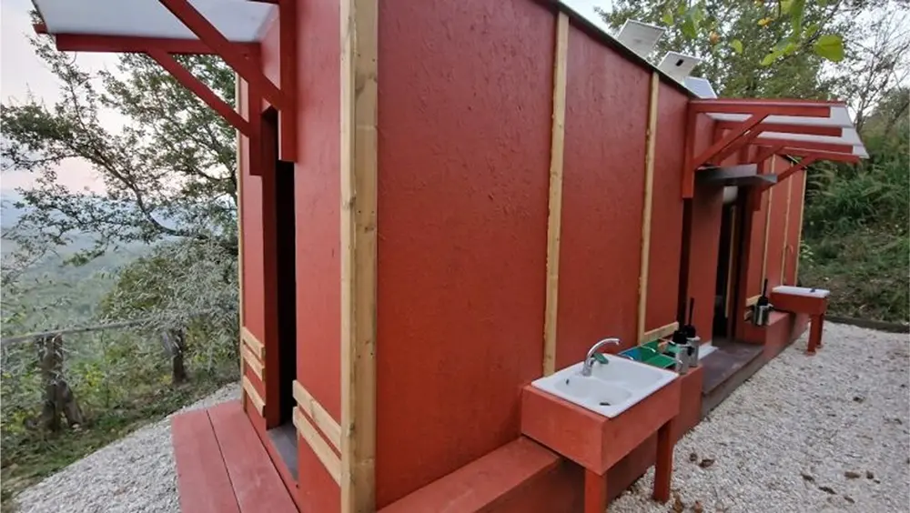 Bagni e docce con acqua calda sono ospitati in una struttura in legno, autocostruita, che offre uno splendido panorama sulla vallata.